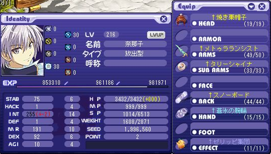 ステの方はというと、小剣装備しつつINTカンストを目指したらこうなり・・・。