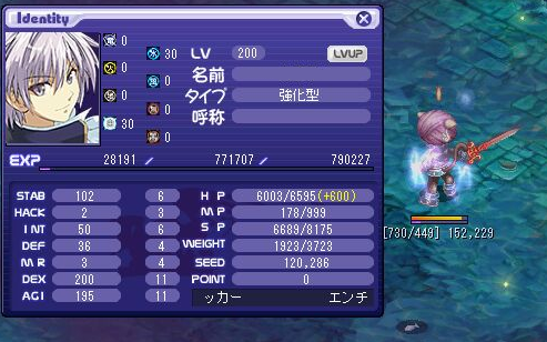 LV:105 STAB 2 HACK 110 INT 1 DEF 15 MR 2 DEX 105 AGI 92