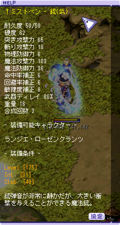 INTがすごすぎる!ジョシュのワンドはテチの魔杖よりちょっと悪いくらいのINTと聖杖のちょっと悪いくらいのMRがあるんだけど、ランジエの場合はINT>>MRみたい。STABもなんか高くない?