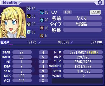 シミュ結果:LV:146 STAB 49 HACK 87 INT 1 DEF 4 MR 2 DEX 168 AGI 155